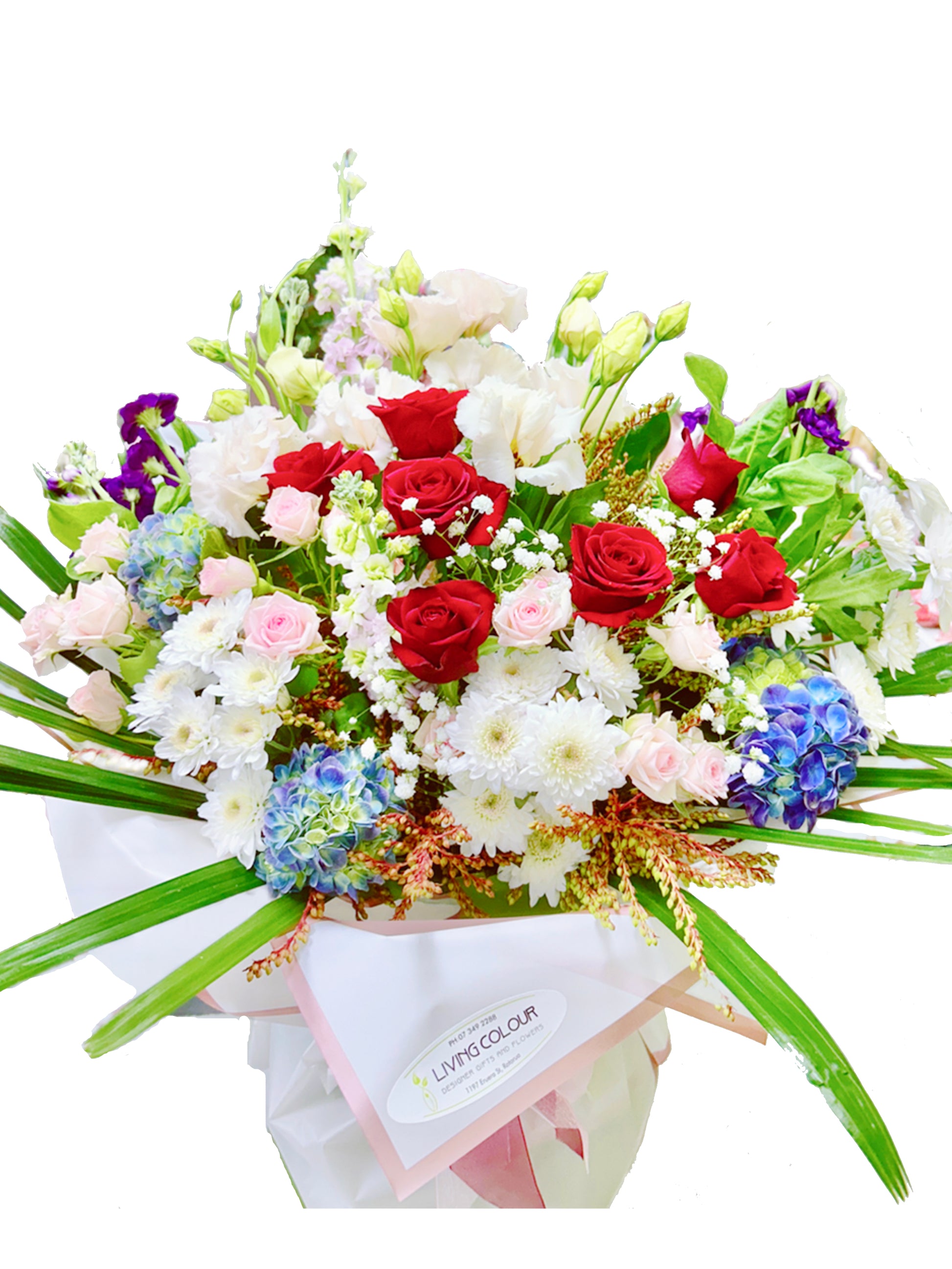 Roses with seasonal mix pretty flowers in a water filled box. The actual flowers and colours will depending on stock availability.